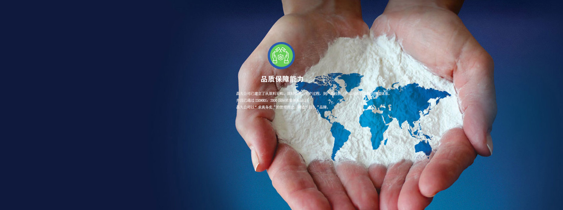 昌久公司已建立了從原料采購、原料檢測、生產(chǎn)過程,到產(chǎn)品檢測、產(chǎn)品出庫的完整的管理體系,并且已通過IS09001:2000國際質(zhì)量體系認(rèn)證。昌久公司以"求真務(wù)實(shí)"的管理理念,鑄造"昌久"品牌。